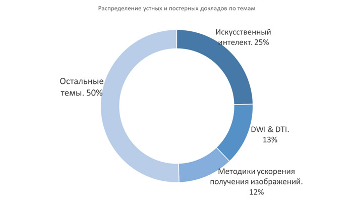 На втором и третьем месте по количеству докладов стоят исследования в области диффузионно-взвешенных изображений и методик ускорений изображений. Компания Philips совместно с крупнейшими мировыми и Российскими институтами и клиниками активно ведет совместные научные исследования в этих направлениях. Так во время пленарной секции лекция профессора Маттиаса ван Оша из Ляйденовского университета (Нидерланды) была посвящена применению методов искусственного интеллекта в решение задач ускорения МР последовательностей. Множество передовых результатов научно-исследовательских проектов в области диффузионно-взвешенных изображений активно становятся доступны всем пользователям оборудования Philips в новом релизе (5.7) программного обеспечения – коррекция артефактов магнитной восприимчивости для DWI (EPIC), восстановление диффузионно- взвешенных изображений (DWI) с любыми b-факторами с помощью методов математической реконструкции (Сomputed DWI), коррекция значений ADC для исключения артефактов нелинейности градиентов (LOVA ADC). Позволяет получать значения ADC с параметром точности вплоть до 95% на больших полях обзора.