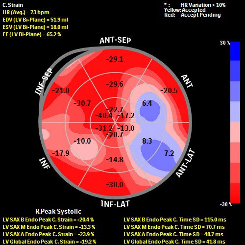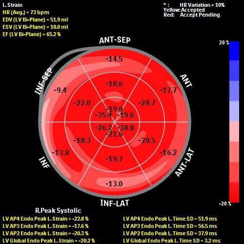 Наиболее вероятной причиной болей и повышения тропонина у пациентки мог быть постлучевой миокардит. Однако, также не исключалось и поражение коронарных артерий с развитием ишемии миокарда. При этом, причиной ишемии могли послужить как лучевое, так и атеросклеротическое поражение коронарных артерий. Было проведено исследование деформации левого желудочка с помощью инструмента autoCMQ, установленного в УЗ аппарате. Оконтуривание областей интереса проводилось в автоматическом режиме. On-cart и auto анализ позволил значительно сократить время исследованияи принятия решения о дальнейшей тактике ведения пациентки.По итогам анализа глобальный продольный стрейн (Global Longitudinal Strain (GLS)) составил -20%, что соответствует нормальным значениям; глобальный циркумференциальный стрейн (Global Circumferential Strain (GСS)) был незначительно снижен 19,2% (норма более 25%). При этом отмечалось снижение локального циркумференциального стрейна в базальных сегментах передней и передне-перегородочной области. Исследование деформации явилось ключевым моментом для дифференциальной диагностики. Снижение глобального циркумференциального стрейна левого желудочка при нормальных значениях глобального продольного стрейна позволили исключить ишемический характер болей у пациентки и подтвердить наличие постлучевого миокардита. Необходимо также отметить что наиболее значимое снижение регионарного циркумференциального стрейна у пациентки произошло в базальных сегментах передней и передне-перегородочной области, что соответствует зоне наиболее уязвимой при лучевой терапии. Было решено воздержаться от проведения коронарной ангиографии. Отмечен полный регресс симптомов и нормализация уровня тропонинов на фоне противовоспалительной терапии.